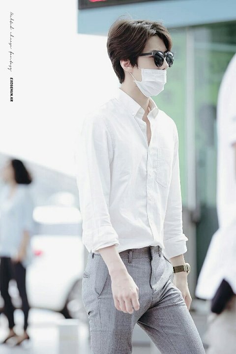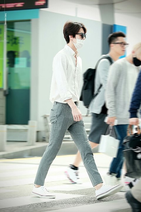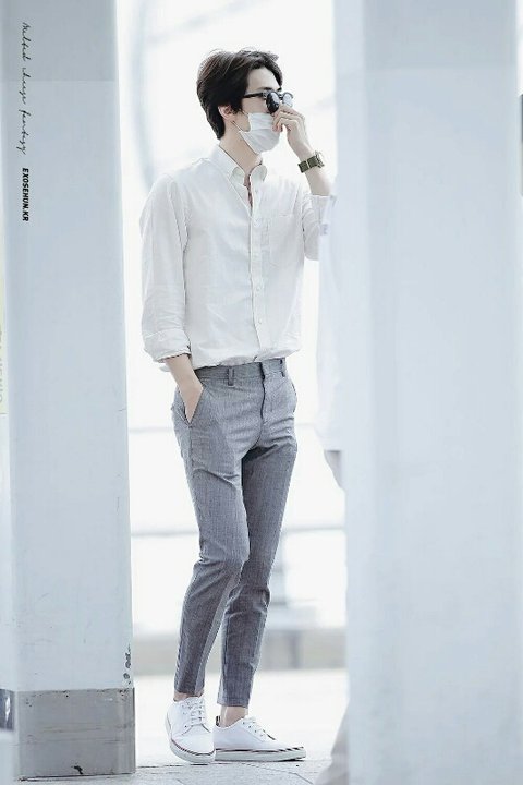 그레이 슬랙스에 무지셔츠와 스니커즈