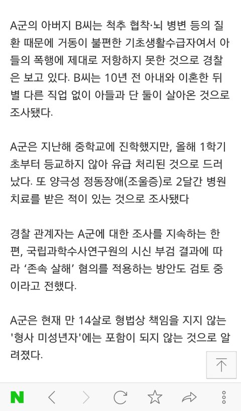 나는 A랑 교회에서 처음으로 만났어 걔가 약간 틱장애? 말 할 때 가끔씩 머리를 떨군다고 해야 하나? 그래. 틱장애가 있고 또 교회 여자애들도 많이 괴롭혀서 하루는 어떤 여자애가 A 구레나룻 잡고 위로 잡아당겨서 걔가 운 적이 있었어. 그래서 난 그냥 걔가 여자애들이 좀 싫어할만한 남자애라고 생각 해서 그냥 이건 좀 아니다 싶으면 말렸지. 그 이후로 이 남자애는 얼굴도 기억이 안 날 정도로 교회를 안 나왔어 한 안 나온지 2년인가 됐을거야 그래서 그냥 다른 교회 다니고 있나보다 싶었는데 이 사건이 터졌더라고. 난 A랑 안면이 튼 사이라고 해서 A를 옹호 하려는건 아니야. 자기 아빠를 피씨방비 안 줬다고 때린 그 애 잘못이라고 생각 하고있고. 물론 A의 죄값도 옳게 받아야지. A가 청소년이라는 이유로 형벌을 줄이는건 도저히 이해가 안 가 14살이면 알 거 다 알고 그럴텐데 돈 안 줬다고 아버지를 살해 했다면 도가 지나친거지. 판에 있는 사람들은 어떻게 생각 하는지 궁금하다. 긴 이야기 들어줘서 고마워^-^
