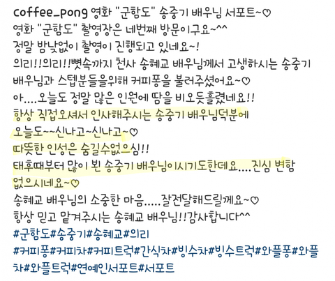송중기는 이런 사람이다. 지치도록 촬영하는 중간에도 마음속으로 다른 사람을 챙기는.