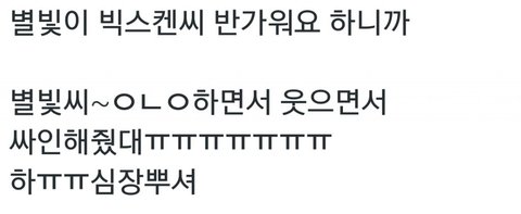 처음에는 멤버들도 당황했는데 이유 알고 다들 귀여워하고 훈훈하고 서로 장난치고 그런가봐ㅋㅋㅋㅋ 별빛들 진짜 삐친거 아니고 장난이니까 너무 걱정하지 않아도 될것같아!