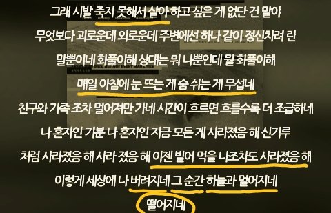 좀 뒷북이긴 한데.. 좋은 얘기도 아니고 너무 파고드는 느낌이라 글 안 올리려했는데 아무래도 이삐들이 여기까지는 생각 못한 것같아서! 마지막(the last)에 보면 의사 선생님이 내게 물었어 ------한 적 있냐고 에서 많은 이삐들이 그 부분은 ㅈㅅㄱㄷ로 추측했잖아 근데 so far away를 계속 듣다보니까 거기서도 그런 암시가 있는 것같아서..