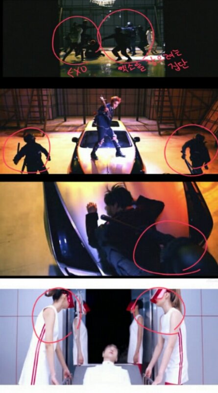 이제다시 로또로 들어와서 엑소 멤버들과 사진속 경찰복을 입은사람들 (검은옷과 헬멧 그리고 봉을 들고있는사람들) 동시에 달려들어 싸움을 하는 장면 보이지 거기서 저 경찰들은 럭키원에나오는 빨간모자의 여자들과 같은 집단이야 로또 당시에 엑소멤버들은 자신들의 힘을 모른다했지? 하지만 그 집단들은