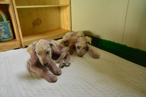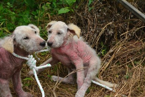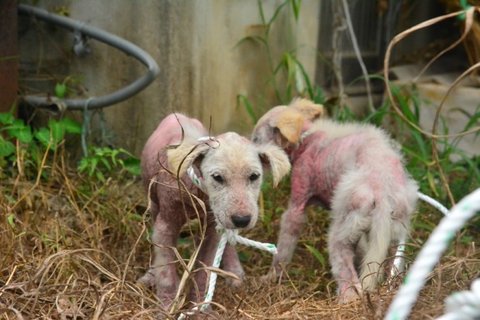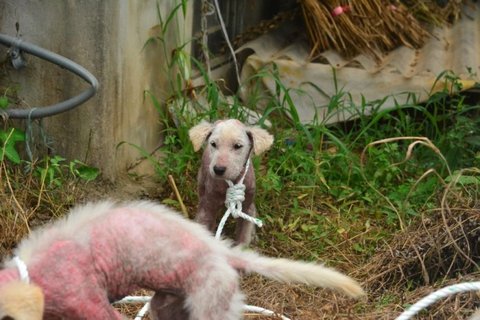 그 곳에는 얼핏 봐서는 강아지의 모습이라고생각하기 어려울만큼 흉하게 변해버린 두 아이가단단한 노끈에 묶여있었습니다.