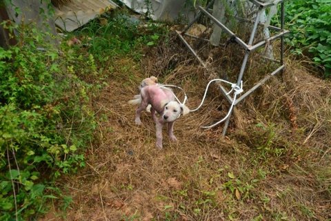 주변에서 강아지가 끙끙앓는 소리가 나서소리나는 쪽으로 가보니지금은 아무도 살지 않는...잡초와 거미줄만이무성한 폐가에 털이 거의 없는 강아지 두마리가묶여져 있는 것을 발견하여 나주천사의집으로제보를 해주었습니다.