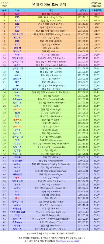 2008년 1월 1일부터 2016년 8월 25일까지 집계된 정확한 수치임. 확실히 인기많은 아이돌들이 대부분 상위권 차지한듯. ㅇㅇ