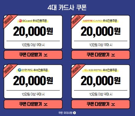 4개 카드사의 카드로 구매하면 2만원씩 매일 할인을 해준다네요.