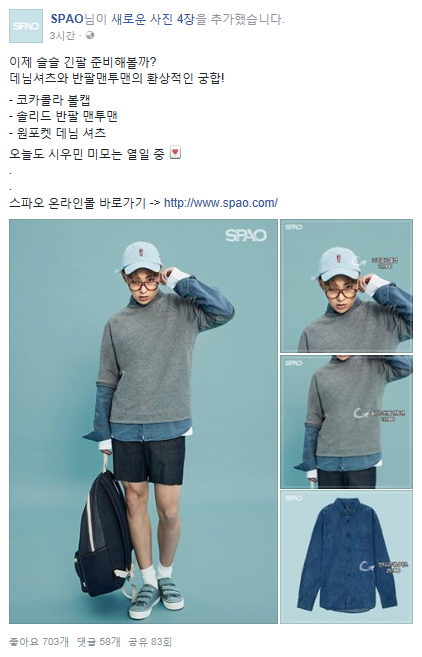 ㅋㅋㅋㅋ 고화질 사진만 봤지 얼굴책에 이렇게 올라온 줄은 몰랐어 ㅋㅋㅋ 역시 스파오가 민석이를 잘 안다 곧 가을옷 둘러보러 가겠어오~~!! 앞으로도 쭈욱 우리 민석이를 영업에 잘 활용해 주세오