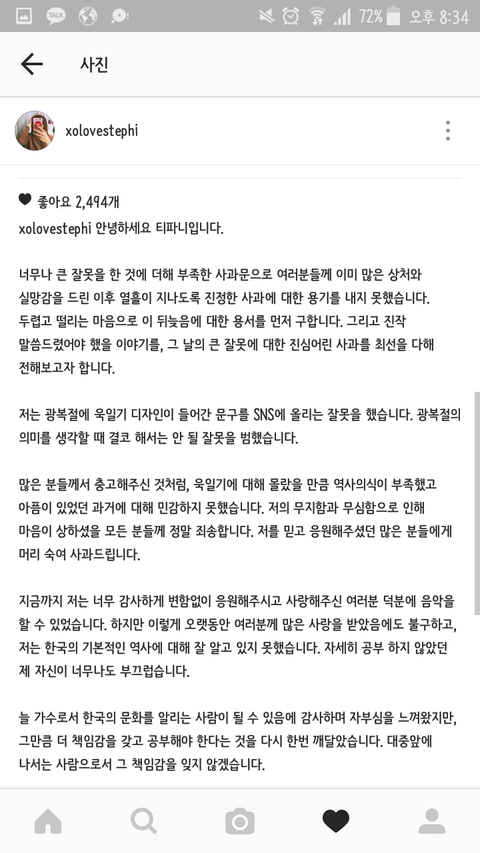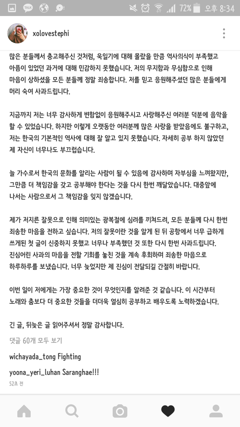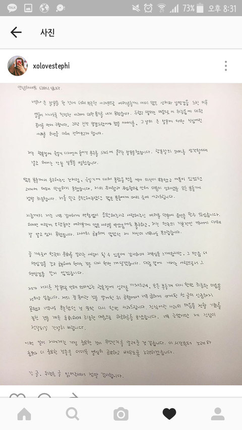 나같아도 전국민한테 비난 받는데 쉽게 써서 올리진 못했을듯. 심지어 점 하나도 하트로 오인 받아서 까이는 판국에 한 글자 하나하나도 신중히 썼을거 같은데. 한국어 읽고 쓰는데 능통하지도 않으면 쓰고 주변 사람들에게 도움 받아 첨삭하는데도 오래걸렸을것 같고. 사과 아예 안하고 넘어간거 보다 오히려 묻히고 있을때 뒤늦게라도 다시 쓴게 그나마 잘한듯. 김구라처럼 의도성 갖고 그딴 발언한 사람도 기회가 주어지는데 모르면 반성하고 다시 배우면 될일.