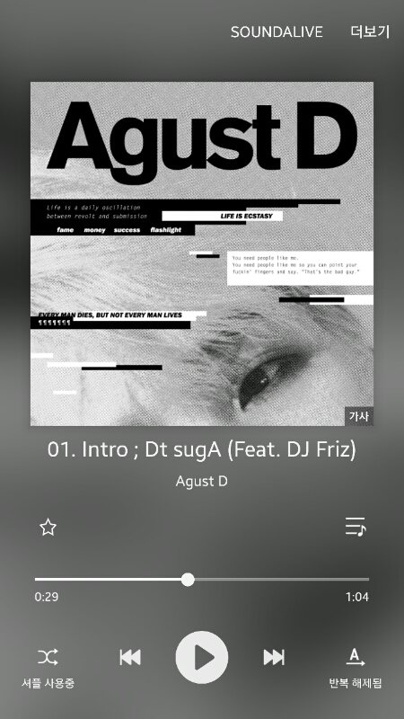 29초에 두번째이름이라고 음성변조? 되서 겁나 빨리나옴 나만 모르고 있었던거니? 아니 이게 무슨말이지하고 자세히 들어봤는데 두번째이름이라고ㅜㅜㅜ 0.5배속으로 들으니까 분명하게 들린다 Agust D가 두번째이름..... 별로안놀랐다면 ㅈㅅ... 다시한번 민윤기의 천재성을 확인했다;ㅁ;