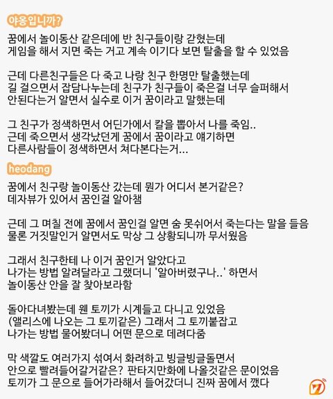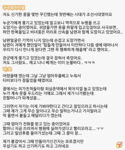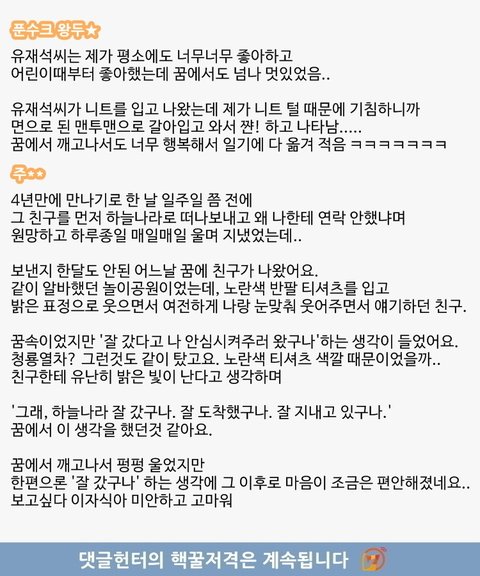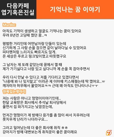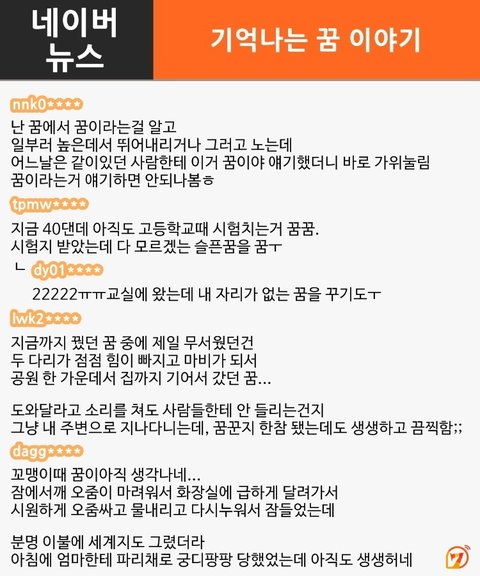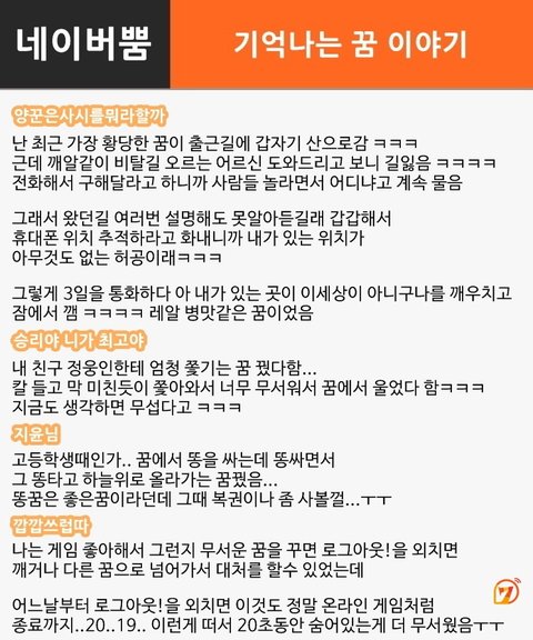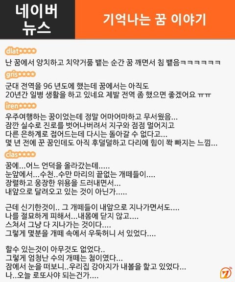 * 관련 포스트기억나는 꿈 이야기 1탄 <댓글헌터 68>꿈꿀 때 이런적 있다 外 <댓글헌터 49>잠꼬대 일화모음 外 <댓글헌터 40>층간소음의 해피엔딩 外 <댓글헌터 64>엘리베이터에서 생긴 일 外 <댓글헌터 18>