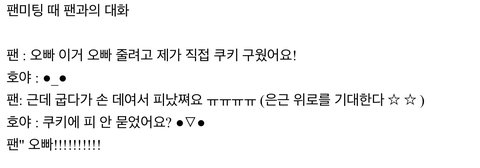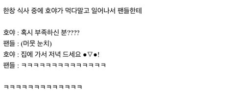 호야가 생일을 맞아 개인스케줄 방청을 와 준 팬들에게 저녁 식사를 대접한다고 방송국 근처의 동태탕 집을 감. 메뉴는 동태내장탕과 족발.