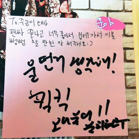 왜 우냐고 울지마라고 손으로 머리를 감싸줌ㅋㅋㅋㅋ그때 정말 당황했었..사실 기억력도 안 좋고 운다고 말도 잘 못하구 와서ㅋㅋ기억이 잘 안난다..그냥 집에 와서 심장폭행 당한 포스트잇이나 올릴게..☆