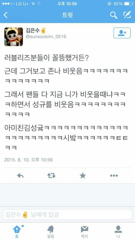 하니귴ㅋㅋㅋㅋㅋㅋㅋㅋ그리고 잉피가 조공을 안해서 욕먹었던 그때 난 그런글들을 보고 엄청웃었지 왜냐 내가 그 전날 콘을 갔다온 사람이기때문이었지