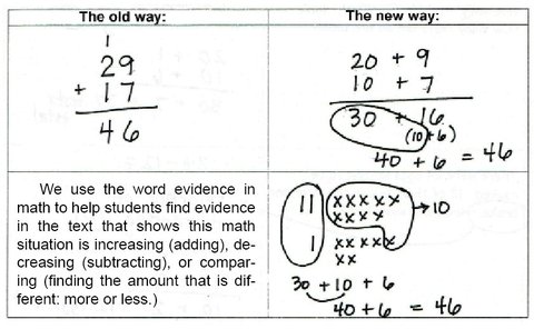 아래 나오는 사진이 (구글에서 첨부하였는데요), 예전에 수학 문제를 가르친 방식과 현재 가르치고 있는 방식을 잘 비교해줍니다. 29+17이 왜 46인지를 학생들이 이해할 수 있게 도와주는것입니다.