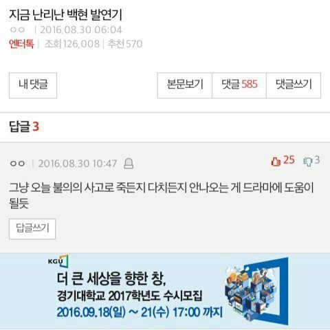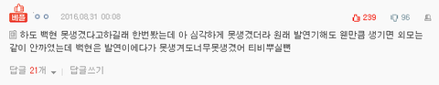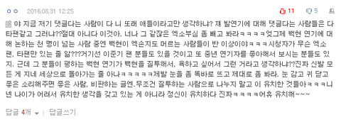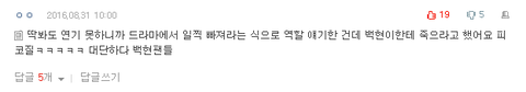 니네가 까고자하는 부분이 연긴지 백현자체인건지 모르겠단얘기야ㅋㅋㅋㅋㅋㅋㅋㅋㅋㅋㅋㅋㅋㅋㅋ너네가 정말 백현이 연기를 못한다고 비판하고 싶었던거면 적어도 와꾸가 빻았고 얼굴 캡쳐해가면서 이꼬라지로 드라마 나온다고 하질 말아야되는거 아닌가ㅋㅋㅋㅋㅋㅋㅋㅋㅋㅋㅋ?