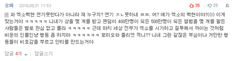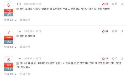단순히 백현연기가 어색했다는 댓글들을 내가 캡쳐해왔으면 모를까 죄다 인신공격에 연기와는 전혀 관련없는 외모비하까지 같이해서 이때다 싶어서 까는것들이 한둘이 아니니까 하는말이야ㅋㅋㅋㅋㅋㅋㅋㅋ 그렇게 엑소부심이 아니꼬우면 톡선도배하던 백현 외모비하에 인신공격 글들좀 막아주지 그랬냐ㅋㅋㅋㅋㅋㅋㅋㅋㅋㅋ 까는글은 괜찮은데 쉴드치는글은 아니꼽고 배아파ㅋㅋㅋㅋㅋㅋㅋㅋㅋㅋ? 외모비하에 인신공격이 들어간 댓글들도 백현을 모르는 ㅇ사람들이 쓴거라는 개논리는 안할거라고 생각하는데; 너네야말로 입이 삐뚤어졌어도 말은 바르게 해야지 누가 유치하고 어린건지 상황판단도 못하면서ㅋㅋㅋㅋㅋㅋㅋㅋㅋㅋㅋ 톡선 난리네 발연기라고 어그로끌고 하와이 간거에 한참지난 일들까지 끌어와서 까는것들이 참ㅋㅋㅋㅋㅋㅋㅋㅋㅋㅋ 이정도면 너네가 그냥 열폭하는거라곤 생각안하나; 지들논리는 맞고 우린틀리고 개논리 지렸다
