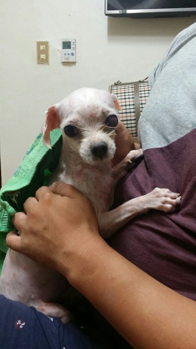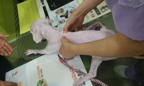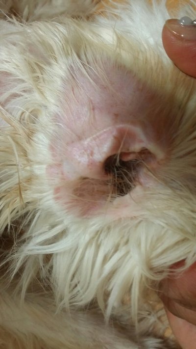 전신 피부병 증상으로 붉게 물들어있었고 양쪽귀는 관리 받지 못해 갈색으로 변한 상태이고.