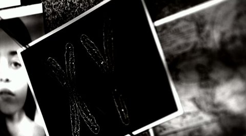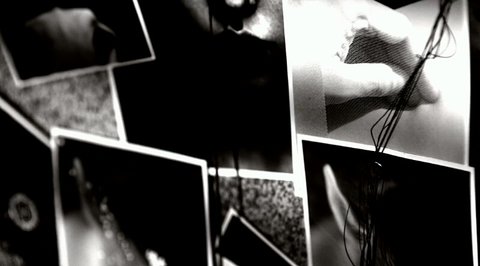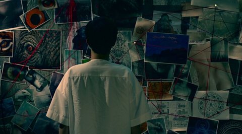 벽에 여자의 눈코입술사진이 잔뜩 붙어있음 특히 눈사진이 많은게 사람이아닌 동물?의 눈사진도 여러게 있음