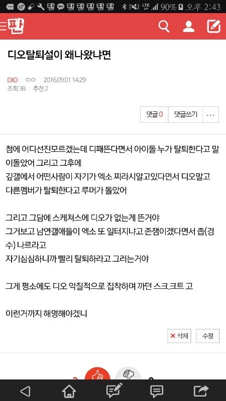이거보면알겠지만 베톡이랑 똑같지 얘가 이 글쓴이고 남연갤애들이 자기들 심심하다고 엑소망했으면좋겠고 디오 욕하고싶다고 퍼트린 악질 루머임