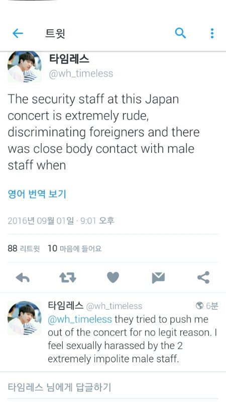 우효니 외국 홈1마인데 번역보니까 대충 스탭들이 무례했다고,본인을 무작정 막 밀어냈다고,신체접촉 얘기도 나오고... 진짜든 아니든 엄청 빡센가봐...홈1마들이 막 무섭다고 트1윗하고