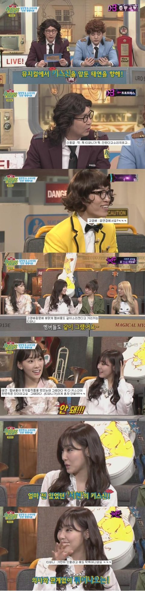 ...해명하면 반대만 먹이고 튈거 뻔한데ㅋㅋㅋㅋㅋㅋㅋㅋㅋㅋ아니 뮤지컬에서 소리지르면 안되는거 누가모름? 근데 저부분은 배우들이 관객반응 유도하는 부분이었고 다른날공연에는 관객이 여자주인공 잡아서 규현한테 데려다주는 해프닝도 있었음 오히려 저날 주변관객들이 태연,티파니 대놓고 핸드폰 완전 가까이대고 사진찍고 공연하는데 계속 뒤돌아서 쳐다보고 그랬는데ㅋㅋㅋㅋㅋ; 애초에 호응유도하는 부분이었고 티파니 목소리는 그 앞,뒷줄 사람들만 들을만한 목소리엿음 이거 조작해서 퍼날라 까이던건데 또 이렇게 떠서 왜곡되 까이냐....팩트는 좀알고 가라제발;