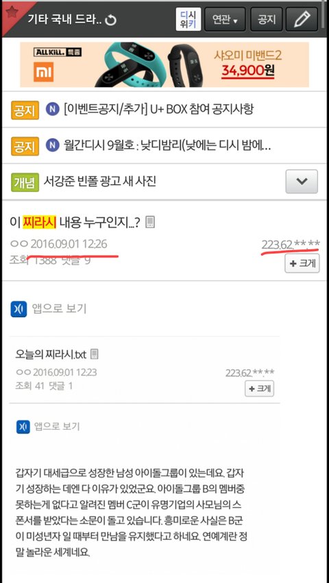 혹시나 했는데 오늘도 오만 갤 돌아다니면서 9월 남자아이돌 찌/라시라고 뿌리고 갔더라 223.62 아이피 그대로