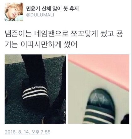저거 볼때 생각했던건데 슬리퍼의 공기의 흐름이 남준이인거가탘ㅋㅋㅋㅋ민윤기는 항상 이상한곳에서 씹더규ㅠㅠㅠ이상한건 아닌데 예상치 못한곳?ㅠㅠㅠㅠ사랑해❤️❤️❤️❤️
