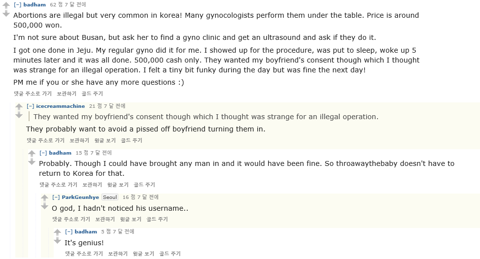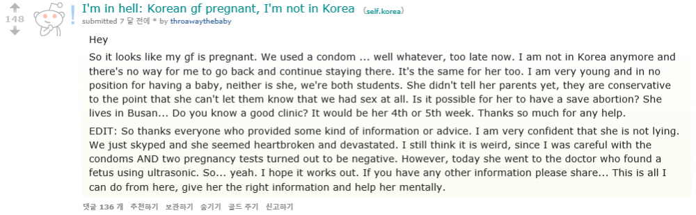 요약: 한국에 잠깐 있다가 한국여성과 잠자리를 가졌는데, 꼭 콘돔을 꼈거든? 근데 한국여자애가 임신했다고 했는데, 얘네 부모님은 우리가 섹스한 지 모른단 말야 ㅠ 이 여자애를 낙태 시킬 수는 없을까? 좋은 병원 있으면 소개 시켜줘. 고맙다. (수정: 초음파로 9주짜리 아기를 발견했어, 이 아기를 지울 수 있도록 정보 공유를 좀 해줘 여기서 너네들이 도와줄 수 있는 건 그거 밖에 없다)