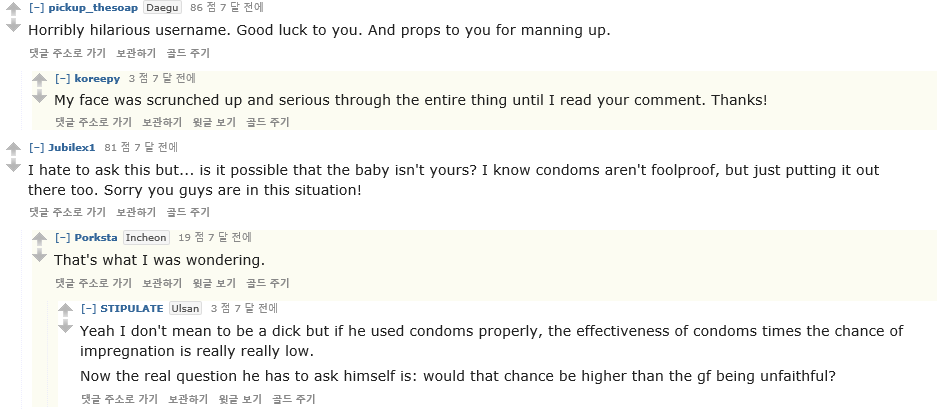 --"솔직히 제대로 콘돔 사용하면 임신 될리가 없음, 이제 글쓴이는 콘돔 확률을 믿냐, 지 여친의 말을 믿냐 이거다"
