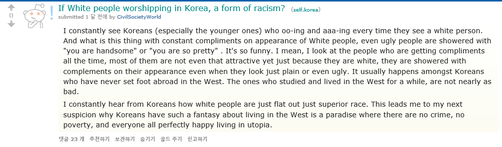 글요약:ㅋ 한국에 존재하는 "백인 찬양"이거 뭐임? 인종차별임? 막 길가다가 백인들만 보면 우와- 하거나 아아아_하면서 "와 예쁘세요" "너무 잘생겼어요"하는데 우리 눈에는 그렇게 잘생긴애들 아니고 솔직히 조카 못생긴 애들도 있는 거 느껴짐?ㅋ 한국인들이 백인들이 우월하다는 것을 입밖에 꺼내는 걸 자주들음. 그래서 한국인들이 서양에서 사는걸, 범죄없이 가난없이 모두다 행복하게 유토피아에서 사는걸로 착각하는 건지 모르겠음