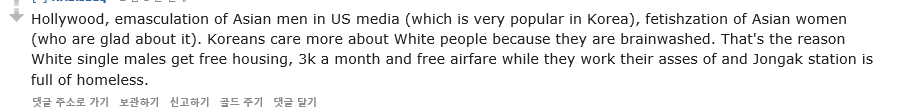 "특히 할리우드와 미국의 미디어(그 둘은 한국에서 굉장히 유명하지)동양 남자의 남성성을 깍아내리는 걸 좋아 하니깐, 그리고 동양여자에대한 환상을 품어주고(근데 한국인들은 백인들이 동양인 페티시 있는거 되게 좋아하잖슴). 한국인들은 대부분 백인들한테 세뇌당한거임. 그래서 백인 남자들이 한국에서 공짜로 집을 얻고, 반면 한국 지하철에는 거지들이 구걸을 하는거임."