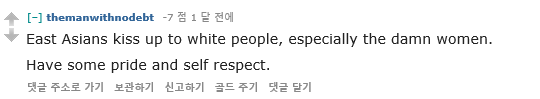 "동양 아시아인들은 백인들 똥꼬빨지, 특히 동양여자들이. 세상에 동양인들아 자존감 좀 가져라"
