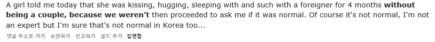 "4개월 동안 외국인이랑 커플도 안 하고 키스하고, 섹스하고, 껴안고 자던 한국여자애가 어느날 묻더라, '나한테'우리관계 이상하지 않냐고. 당연히 이상하지. 문제는 내가 내 나라에서는 그런 여자 전문가가 아니였다는 거임^^"