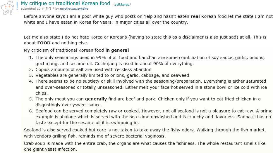 글 요약하자면 한국음식에 관한 평가인데, 음식점 전체가 썩은 이스트 냄새가 난데. 양념도 고추가루 간장 밖에 없고. 쓸모없는 얘기들임. 걍 맛없다.