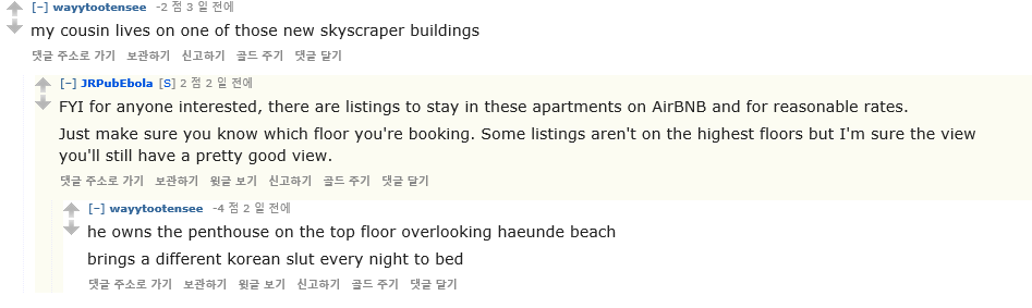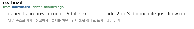 ---"이글을 읽는 모두에게, 여기 있는 남자가 쓴 다른 댓글을 읽어보니 엉덩이 얘기꺼내는 이유가, 한국여자들 엉덩이를 너무 많이 핥아서 그렇데"
