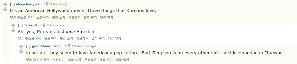 "그건 미국식 할리우드 영화잖아. 한국인들이 미치는 3가지 단어가 다 들어갔음 ㅋ"