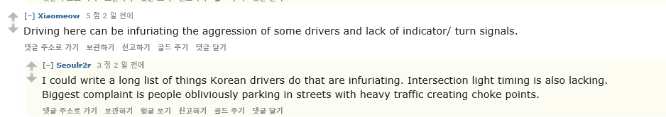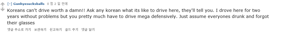 "한국에서 주행하는 건 조카 짜증나는 일임. 몇몇 운전자들은 거칠고, 신호등을 아예 못 보는 듯"