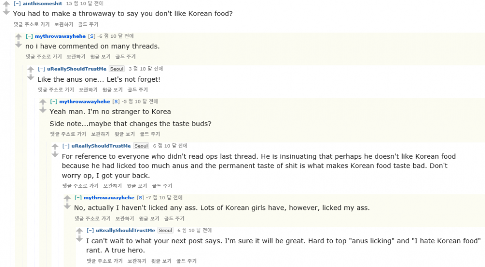 -----"다음 글 기대되네 분명 '엉덩이 핥기'랑 "한국 음식 맛없음" 글 뿐일 테니까