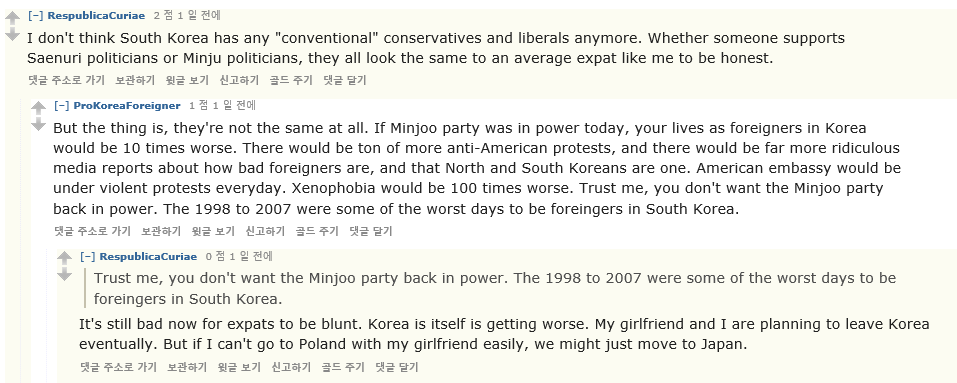 --"한국 자체가 나빠지고 있는데 뭔 소리야, 민주당이 다시 권력을 잡으면 안 된다니. 나랑 내 여친은 한국을 언젠가 떠날 작정임. 폴란드에 가지 못할 시에는 일본으로 갈 생각임^^" - 네 다음 폴란드 홍어