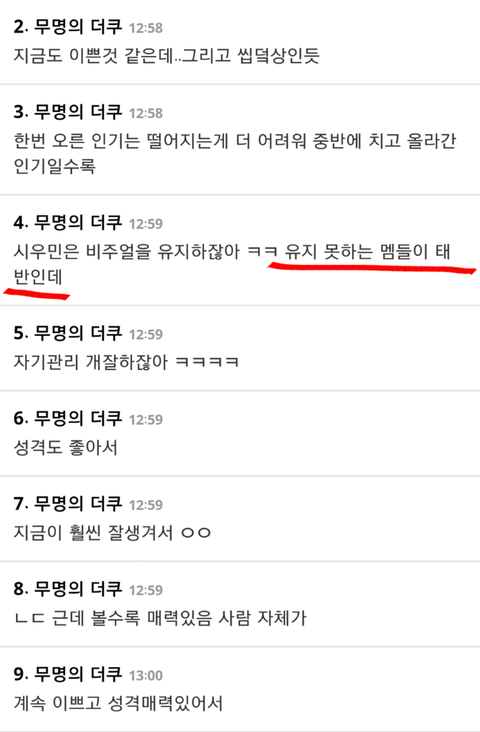 시우민 인기유지되는거 신기하다는글에 굳이 다른멤버들 소환해서 까고싶음?