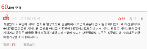 추가한 댓내용 보면 샤이니 이용해서 시우민 까는 조작새끼야 니가 들고온거 트윗샤니빵팬이 쓴 내용도 아니고 빅뱅팬이 8월에 지들끼리 쓴거=상관도 없는 멘션 캡붙해서 연관짓고 못까 안달이냐라고 저격먹음. 조작시우민집착충은 저런식임 잘라서 마치 사실인양 저러고 조작해서 편집해서 까는거