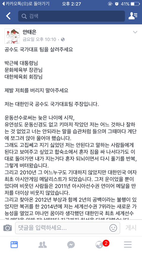 훈련은 고사하고 이제 두달도 채 남지 않은 세계선수권을 갈 수 있을지조차 불투명하고 간다고 해도 저희는 대한민국의 국가대표 선수가 아닌게 되버렸습니다