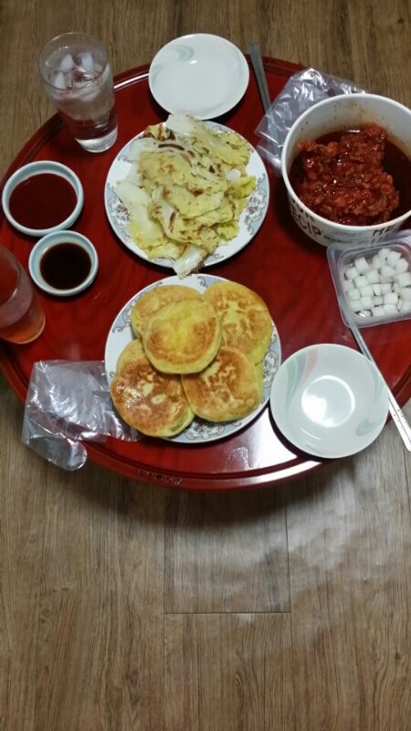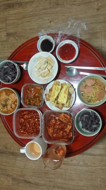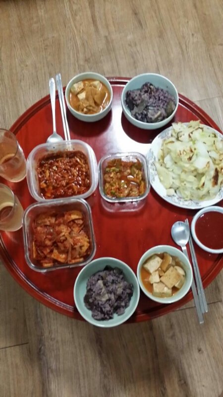 배추전&어묵볶음&배추겉절이&호박볶음&김치두부국&밥