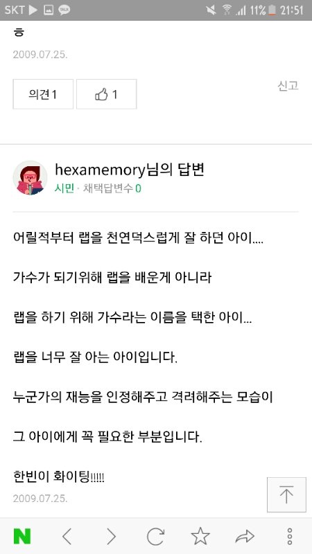 한빈이 7년전에..? 뮤뱅나오고나서 써졌던글인가봐 칭찬많아서 좋다 2009년이면 중1때인거같은데 그 어린나이부터 랩퍼라는 꿈을갖고 계속 노력해서 지금자리에있는우리애들 너무자랑스럽다♡♡