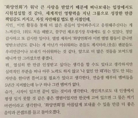 애들도 화양연화로 사랑받은건 감사하게 생각하지만 이제 완전히 끝났고 새로운 시도 하는것 같으니까 우리 이젠 화양연화 보내주자ㅎㅎ