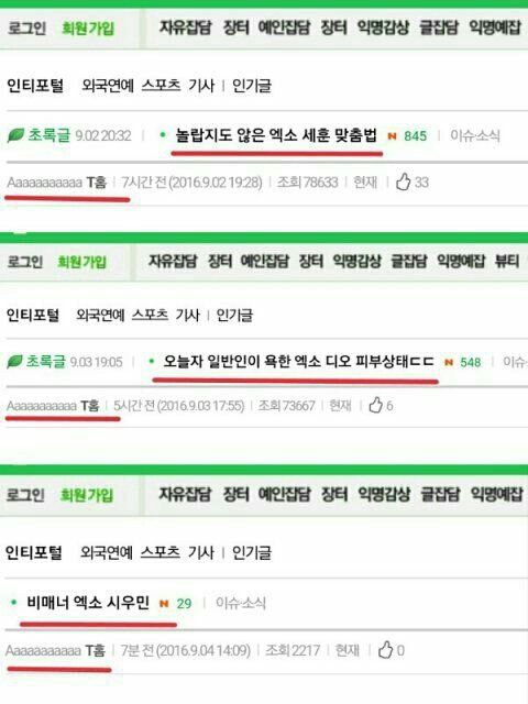 무능력 카이 음치라서 ㅅ염원하던 솔로도 물건너갔고 여친이랑 동거까지 들켰으니 더이상 미래도안보이고 팬질도 노잼이라 악개짓으로 푸는중