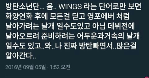 나는 이번 wings가 청춘의 선과 악 중 선은 화양연화 시리즈고 이번 wings가 악으로 나오는거라고 생각하거든 이삐들은 어떻게 생각해?