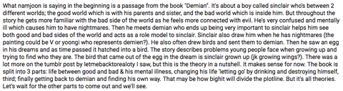 남준이가 맨앞에 영어로 뭐라 하던거는 데미안이라는 책에서 나온 글귀래, 데미안이라는 책은 싱클레어라는 남자에가 두 세계에서 살고 있는건데: 좋은 세상은 그의 부모님과 여자동생이 살고 있는데고 그리고 나쁜세상은 싱클레어 안에 있어.