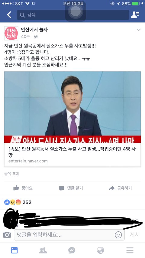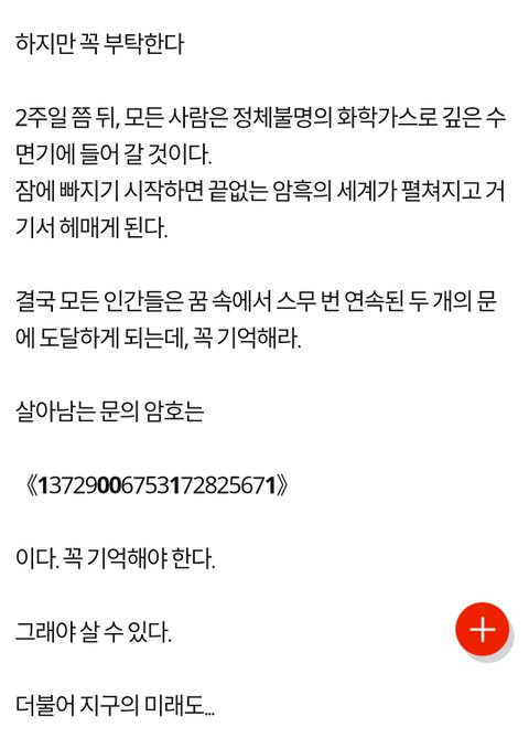 그 혹시 한 2-3일? 전에 누가 자기가 미래에서 과거로왔다고 글쓴거 기억하는사람? 암튼 그 내용이 1주일?2주일? 내로 가스가 유출이 되서 사람들이 잠든다고했었음 이게 막 대한민국사회에 큰 변화? 암튼 그런거 가져온다고 했었는데 오늘 안산에 가스 노출되어서 사람들 죽음ㅜㅜ 안산 사는사람이여서 좀 무서운데 뭔가 소름이다 가스 노출이랑 사람들이잠든다=사람들이 죽음 아근데 내가 너무 의미부여하는건가ㅜㅜ 암튼 난 소름이였음! 저글 기억하는사람 있었으면좋겠다ㅜㅜ 그때 사람들이 댓글도 많이 달았었는데