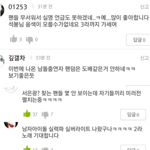 세번째 댓글 뭔말이냐면 어떤사람이 보지도않고 평점낮은거보고 남돌음원안내줘서 테러한거라고 일반화한댓을 달아서 머글분이 쉴드쳐준거 실제로도 멜디들 거기에대해서 거의언급안함 내공이쌓였다 우리도 ㅋㅋ